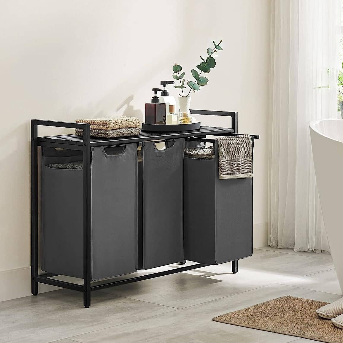 Vasketøjskurv med 3 rum, udtagelige poser, 93x33x72 cm, sort/grå